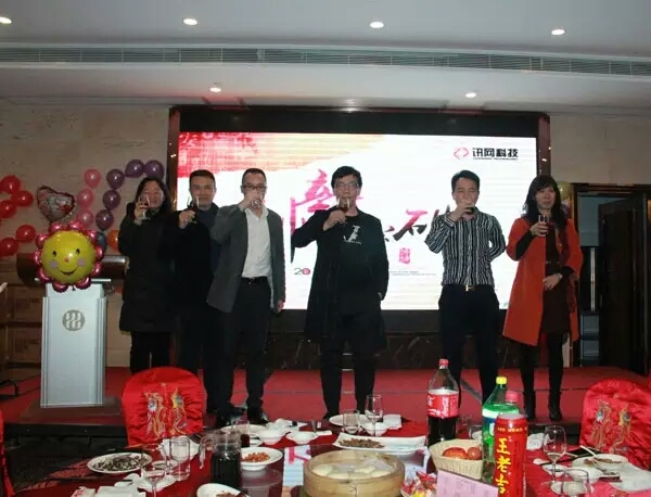 王董攜訊網全體股東上臺向全體員工敬酒。