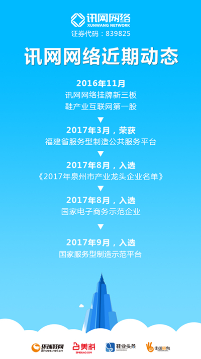 訊網網絡,新三板上市企業,國內領先的鞋行業全鏈條B2B電子商務平臺運營商,2002年成立。十五年來,始終圍繞鞋業媒體資訊、鞋產業B2B平臺交易、SAAS應用三大領域創造性的改變了傳統市場,積累了平臺、用戶、內容、技術、應用等深厚的發展資源,成功打造了“環球鞋網”、“美料APP”、“鞋業頭條”、“中國網訊”、“云商鋪”等品牌平臺。是商務部電子商務示范企業、國家高新技術企業、國家服務型制造示范平臺等榮譽稱號。