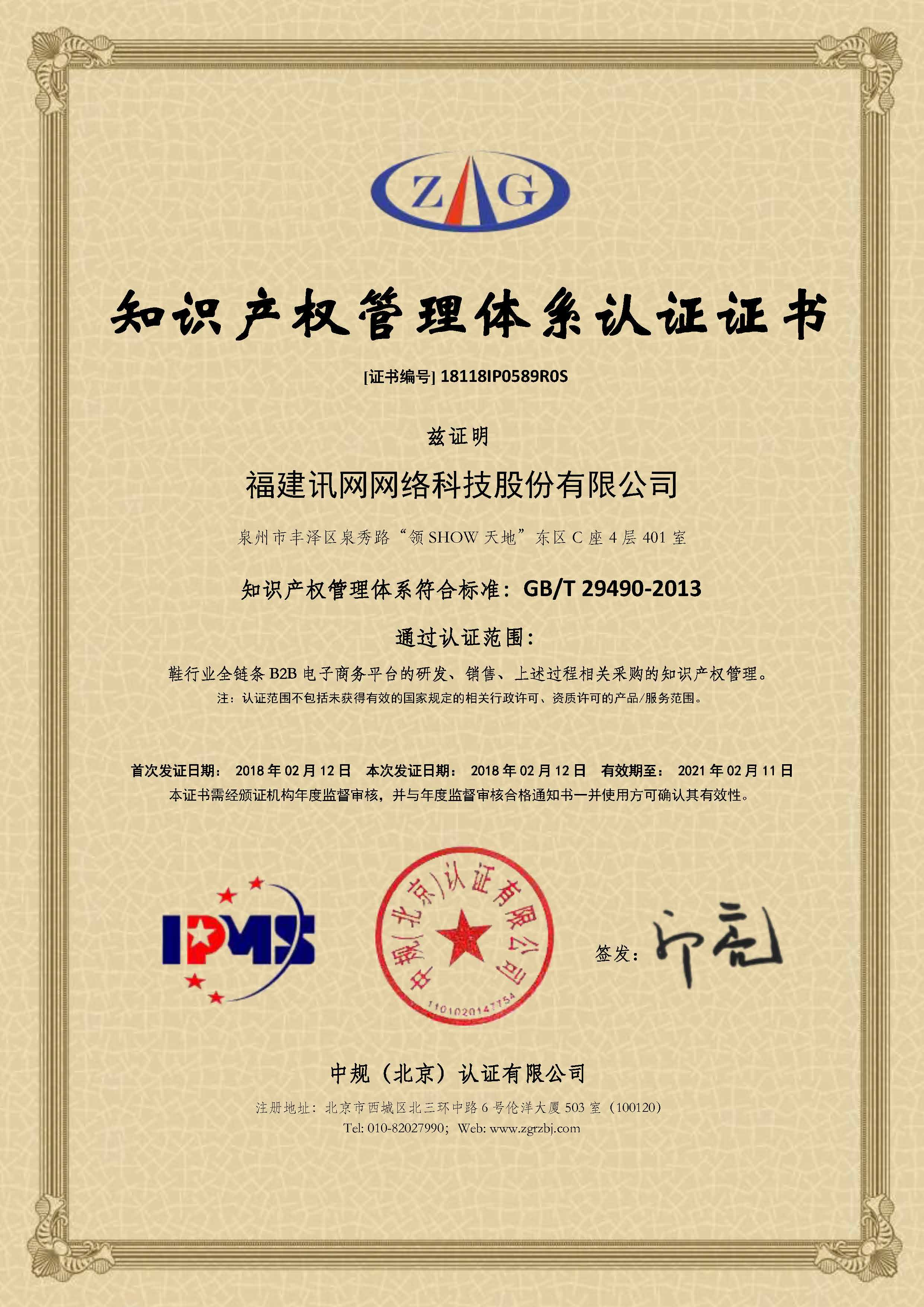 知識產權管理體系認證證書