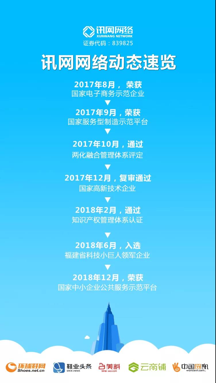 自成立至今,訊網網絡為中小微企業提供互聯網信息化、智能化、電商化等服務,助力中小企業轉型升級,目前已服務中小微企業5000多家。成功打造了環球鞋網、美料APP、鞋業頭條、中國網訊和云商鋪等平臺,是國內鞋業B2B電商平臺運營商、移動互聯網技術服務商和營銷品牌解決方案商。