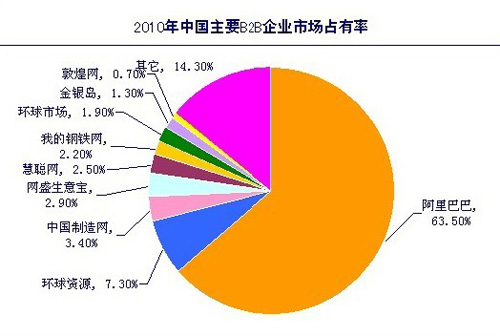 據(jù)中國電子商務(wù)研究中心即將發(fā)布的《2010年度中國行業(yè)電子商務(wù)網(wǎng)站調(diào)查報(bào)告》數(shù)據(jù)顯示:2010年,從營收規(guī)模上看,綜合類電子商務(wù)服務(wù)商的市場份額排名中,阿里巴巴以63.5%的市場占有率位居第一,環(huán)球資源以7.3%的市場份額排名第二,排在第三的則為焦點(diǎn)科技(中國制造網(wǎng)),市場份額為3.4%,排在第四的網(wǎng)盛生意寶份額為2.9%,慧聰網(wǎng)則以2.5%的市場份額位列第五,我的鋼鐵網(wǎng)占比2.20%、剩余的份額則被環(huán)球市場、金銀島、敦煌網(wǎng)等其它靠后幾家服務(wù)商所瓜分。